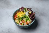 Запеченое филе бедра цыплёнка, микс салатов, эдамамэ, творожный сыр, черри, кукуруза, рис, соус том ям, кинза, кунжут