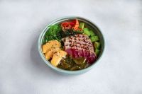 Татаки тунец, авокадо, чука, апельсин, битые огурцы, морковь, рис, кунжутный соус, кунжут, нори